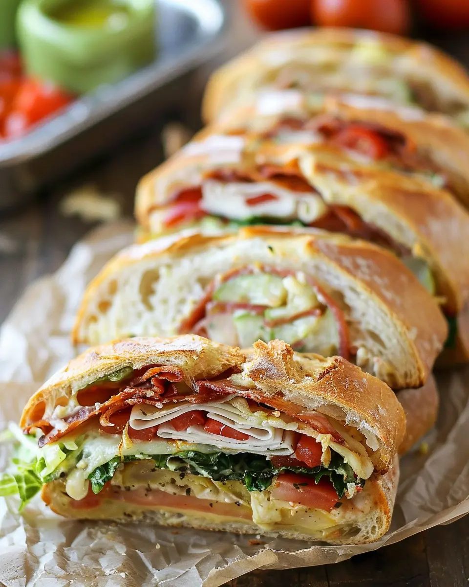 Baked Italian Grinder Sandwiches are a delicious and easy-to-make meal featuring layers of turkey bacon and chicken ham, perfect for any occasion.
