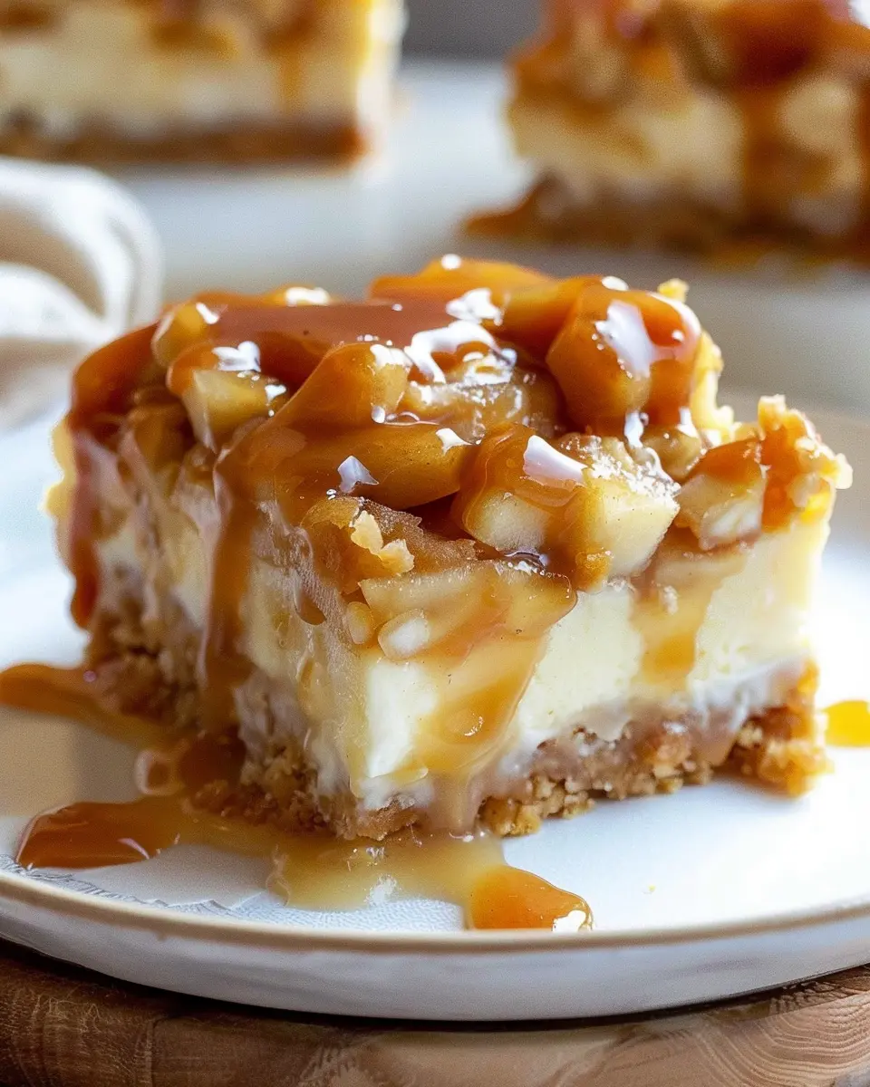 Indulge in the deliciousness of caramel apple cheesecake bars, a perfect treat for fall.