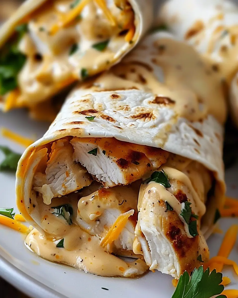 Delight in the flavors of cheesy garlic chicken wraps, perfect for a quick meal.