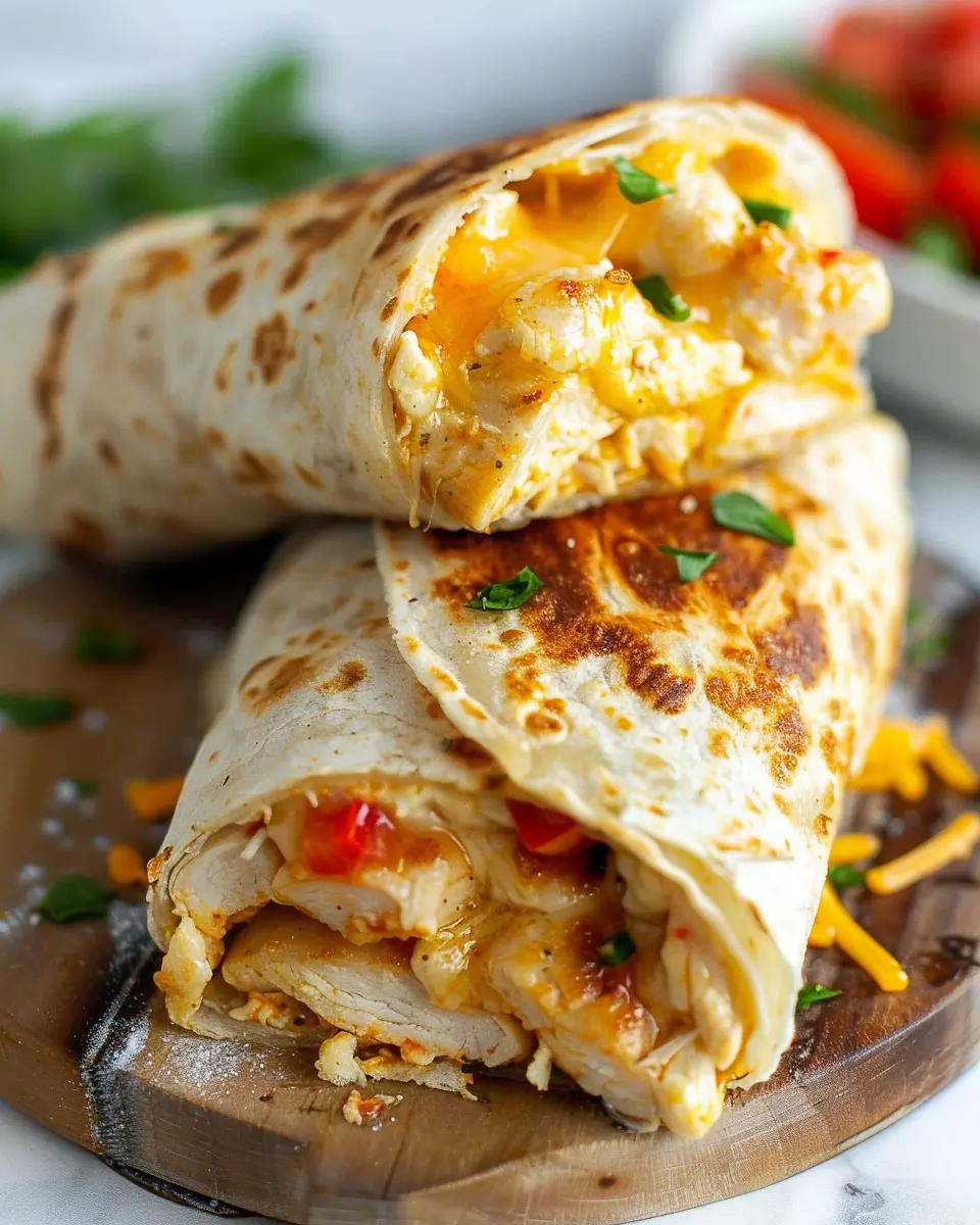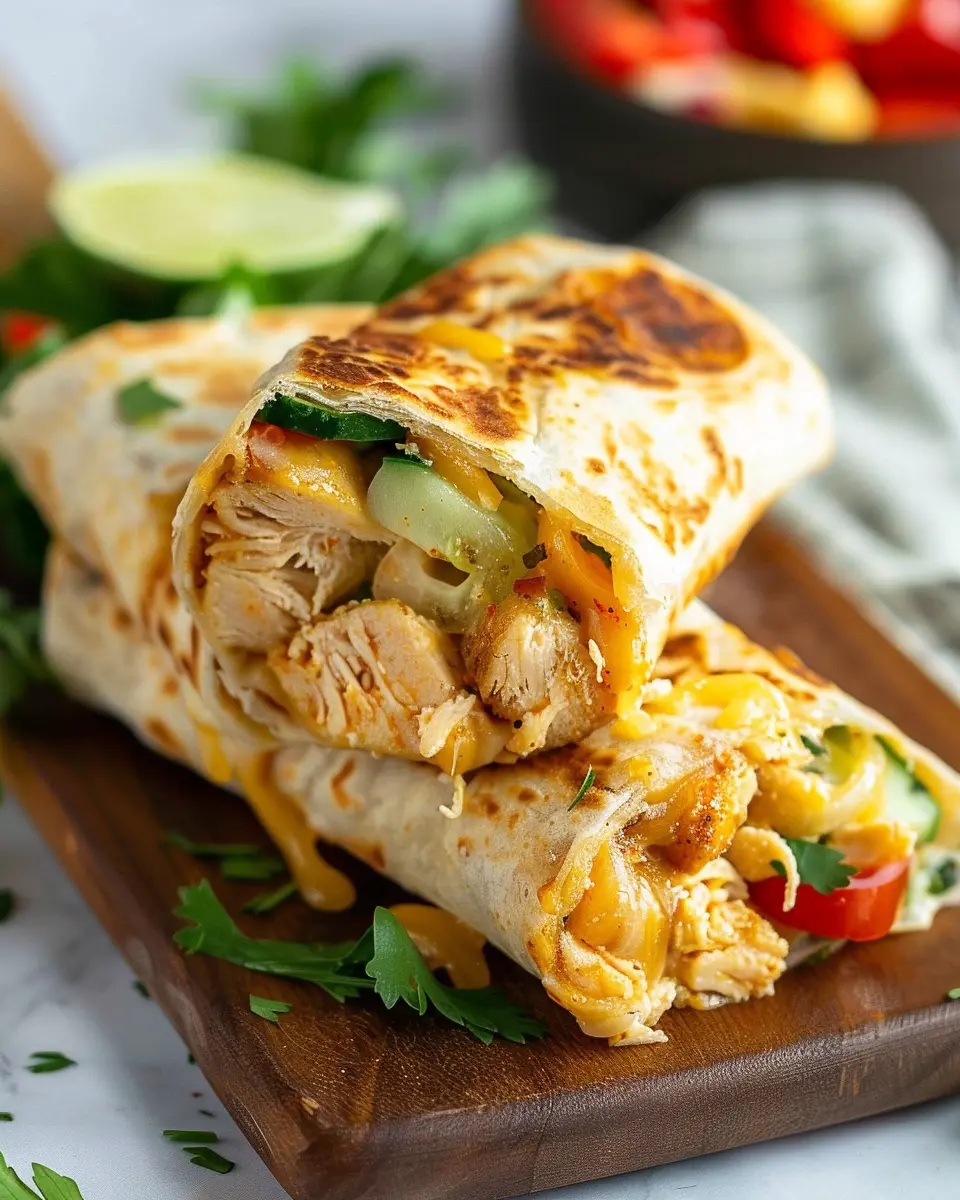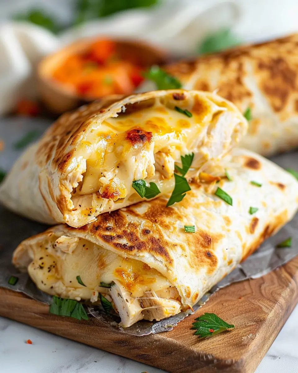 These Cheesy Garlic Chicken Wraps are a simple and delicious meal that brings together juicy chicken, melted cheese, and a burst of garlic flavor all wrapped in a soft tortilla.