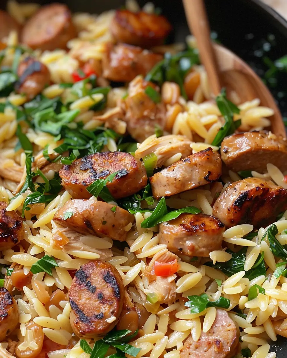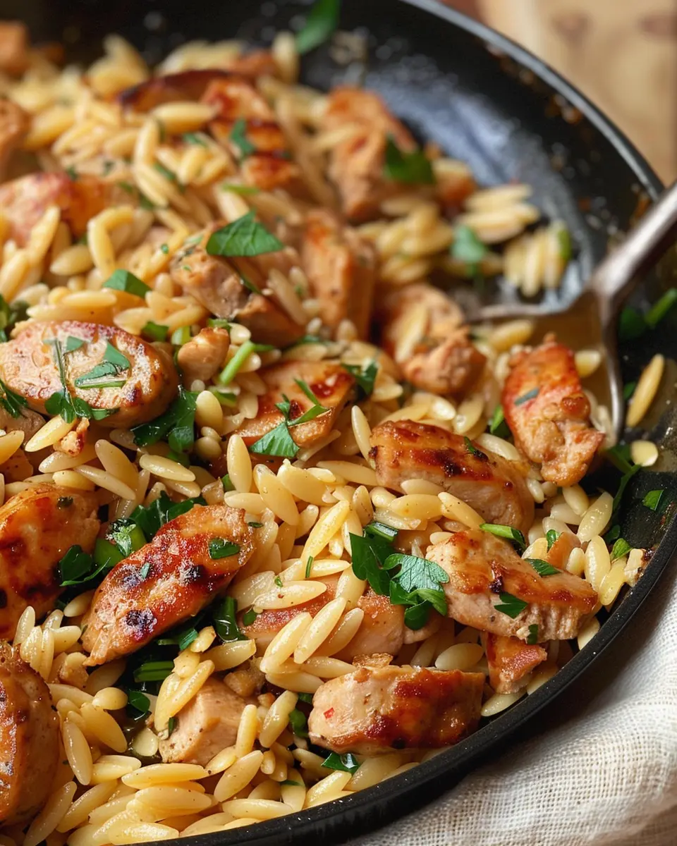 A quick and delicious dinner option featuring chicken sausage and orzo pasta.