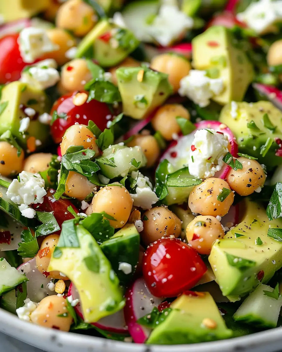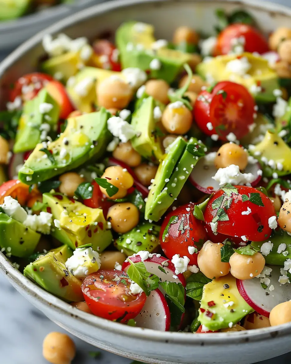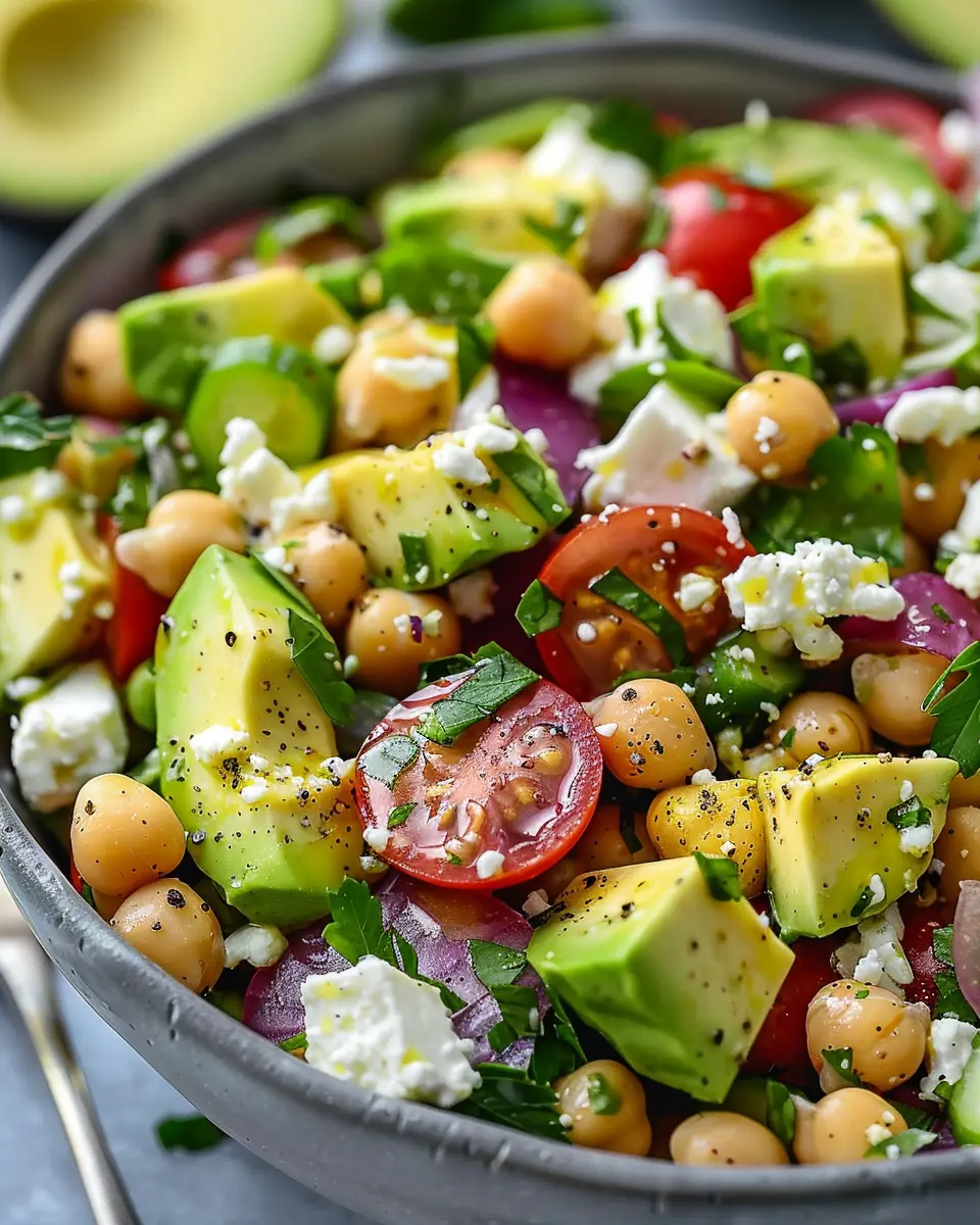 A delicious and nutritious salad that combines the creamy texture of avocado, the heartiness of chickpeas, and the tang of feta cheese, making it a perfect lunch option.