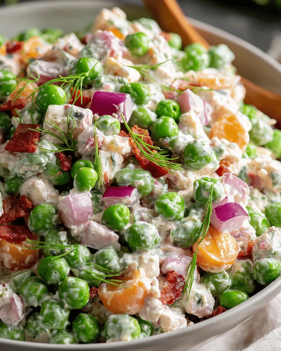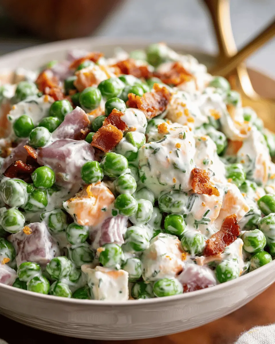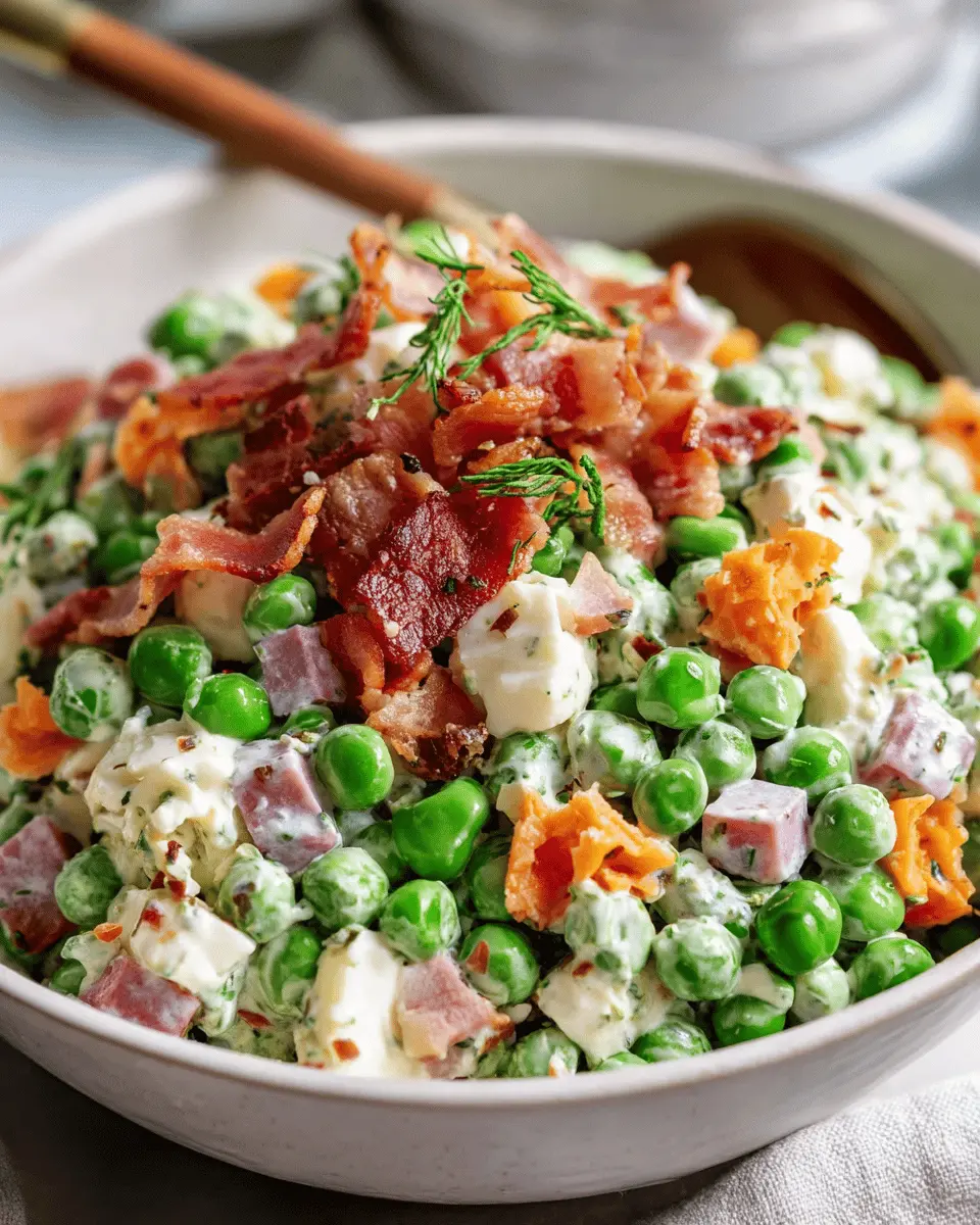 This pea salad pairs beautifully with proteins like grilled chicken or turkey bacon. The smoky flavor of turkey bacon adds a sumptuous crunch, while chicken ham brings a savory note. Serve it alongside a nice piece of grilled beef for a complete meal.