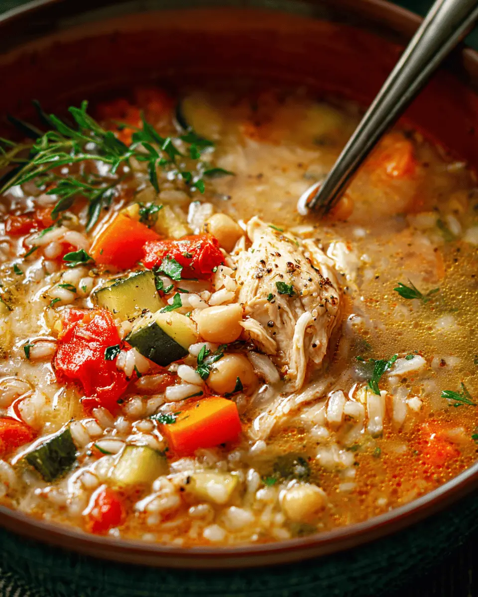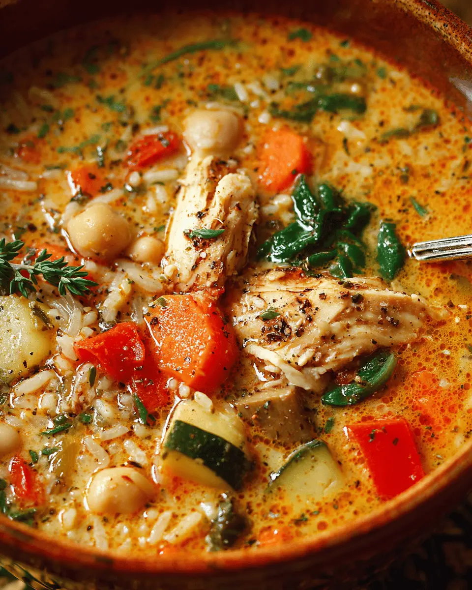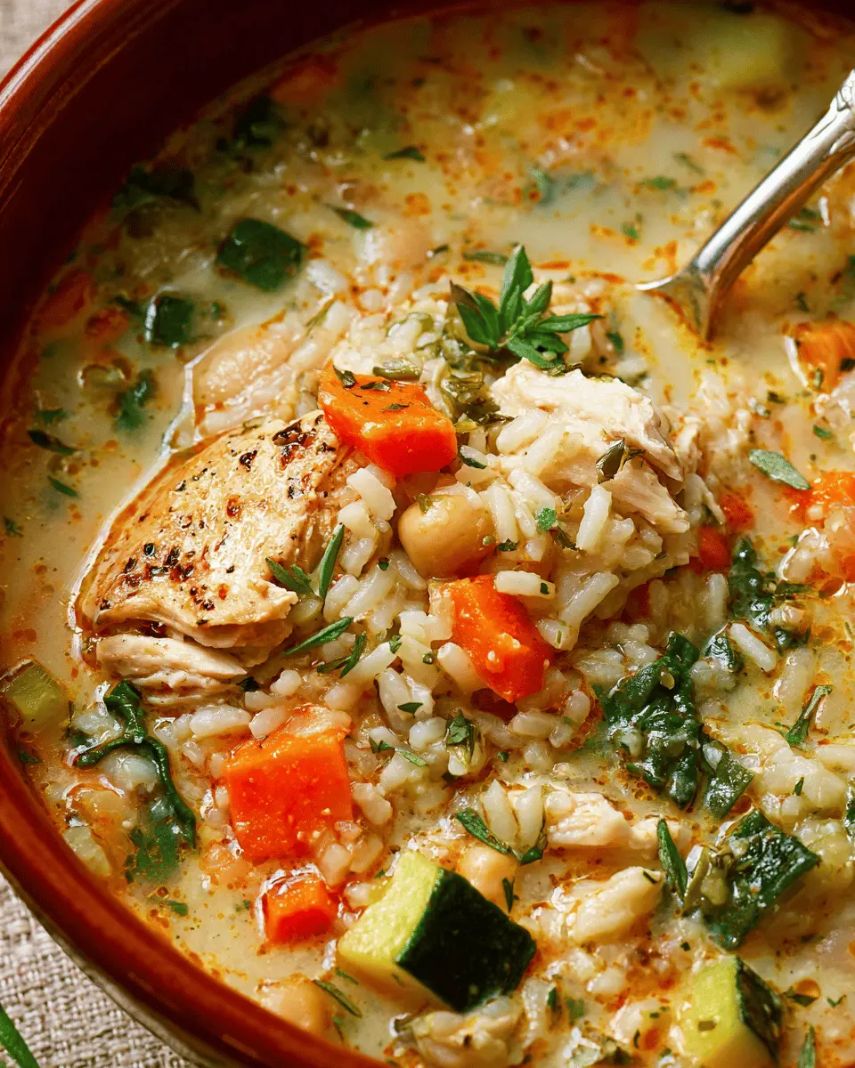 A warm and comforting bowl of creamy chickpea and chicken rice soup packed with vegetables.