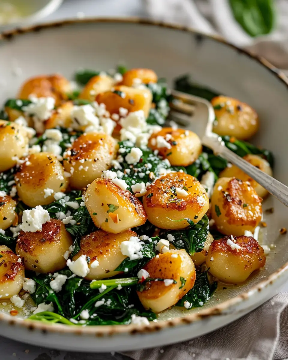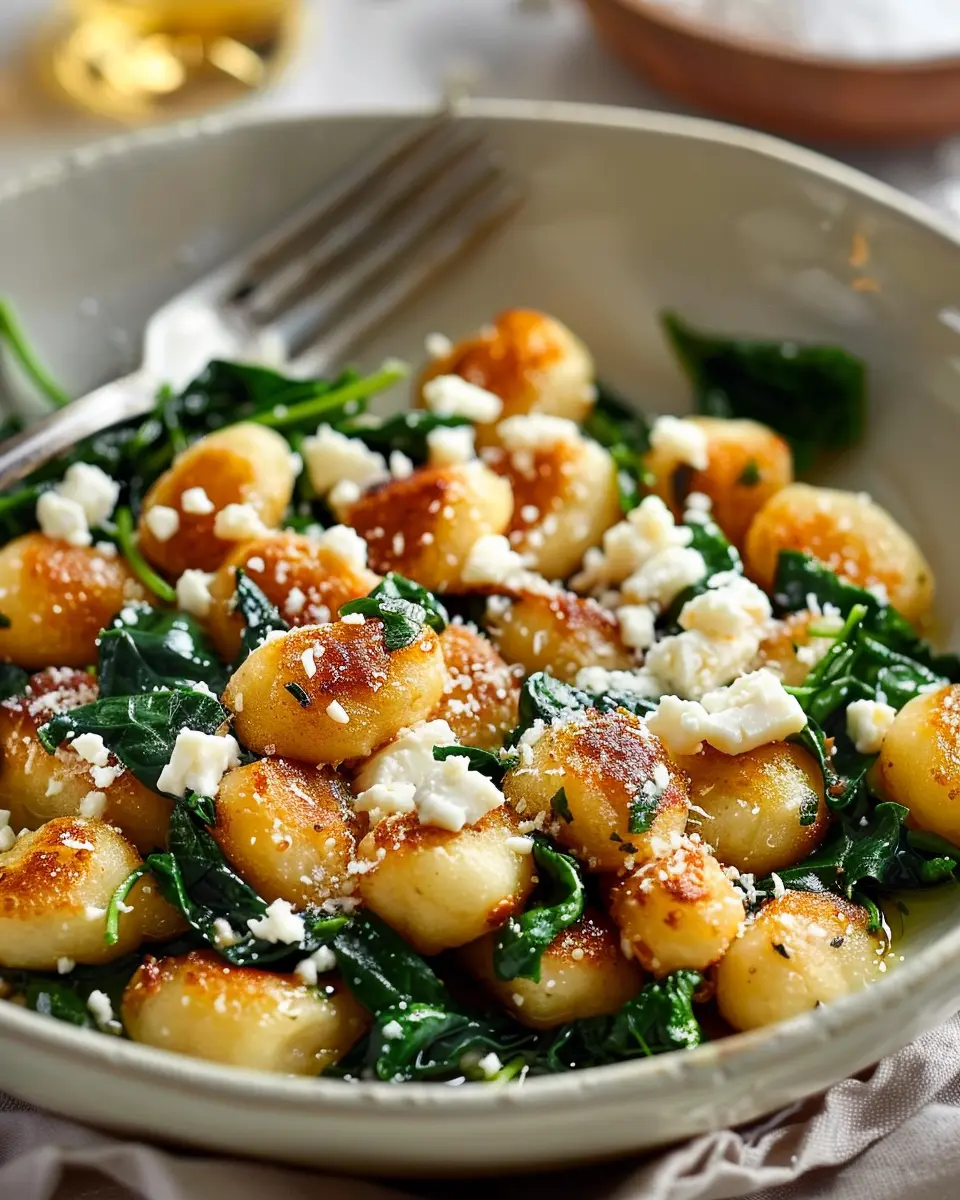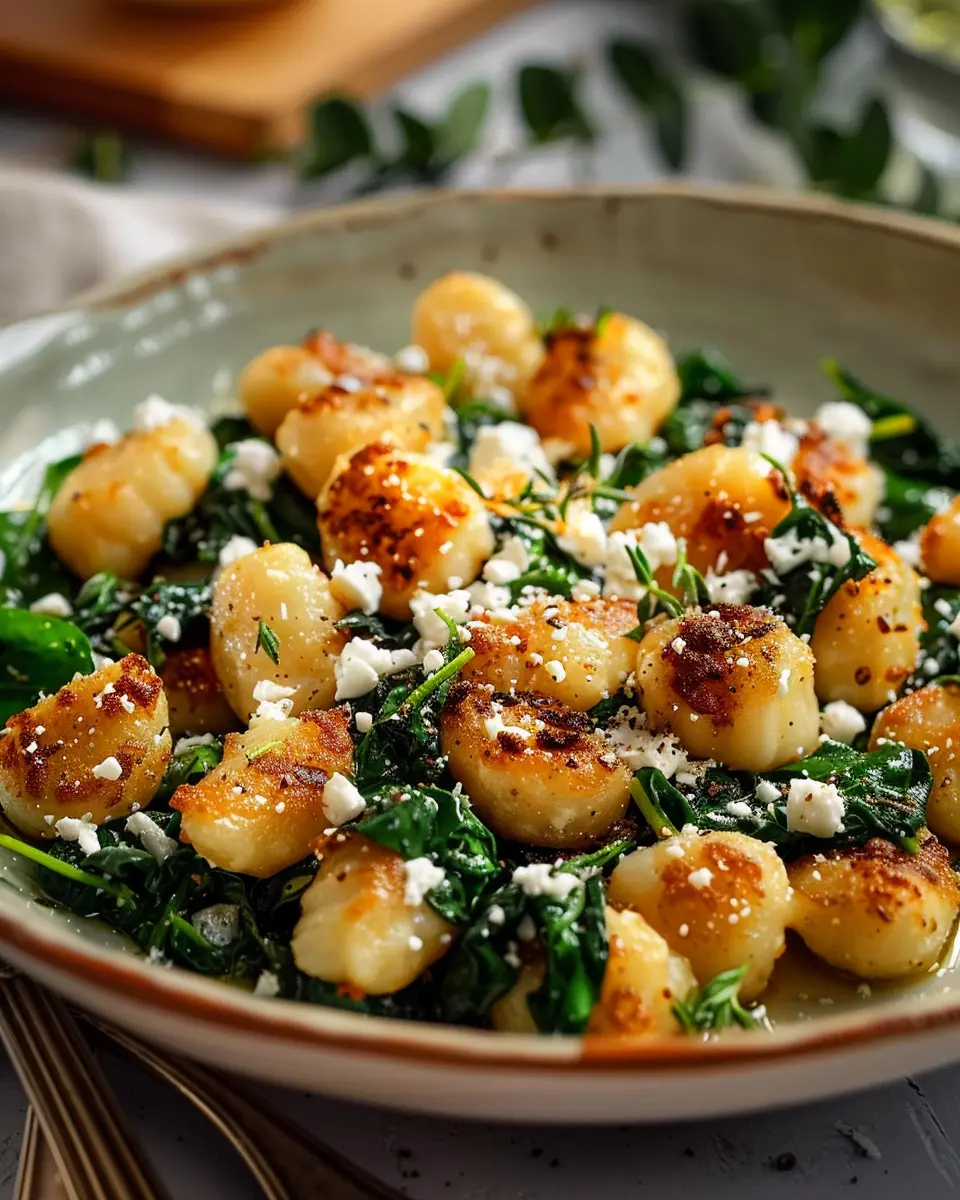 A delightful dish featuring crispy gnocchi, fresh spinach, and crumbled feta cheese, perfect for any meal.