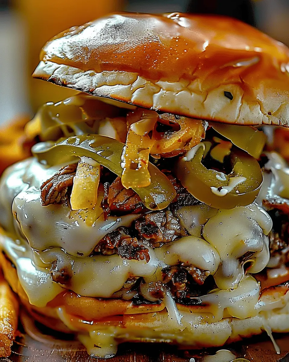 Imagine sinking your teeth into a burger where gooey melted cheese meets the savory goodness of thinly sliced chicken ham and sautéed peppers—all layered between two juicy smash-style patties. A Double-Stuffed Philly Cheesesteak Smash Burger takes the classic flavors of a Philly cheesesteak and turns them into a mouthwatering burger experience. This treat combines the best of both worlds: the deliciousness of a cheesesteak and the satisfying bite of a burger.