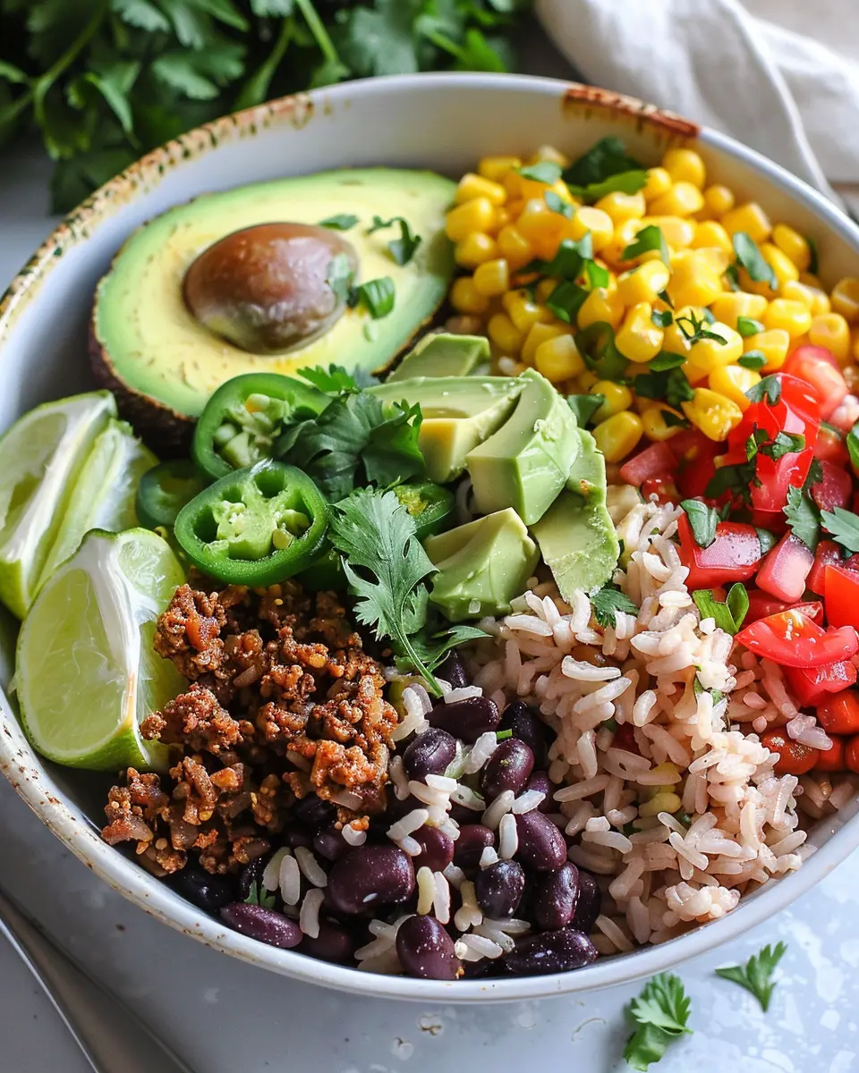 If you’re looking for a meat-free option, you’re in for a treat. A vegetarian taco rice bowl packs in the flavors without any animal products. You can use: