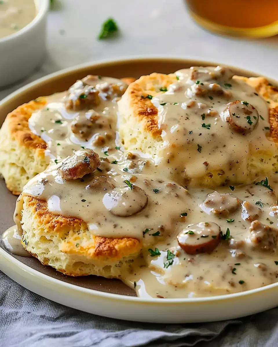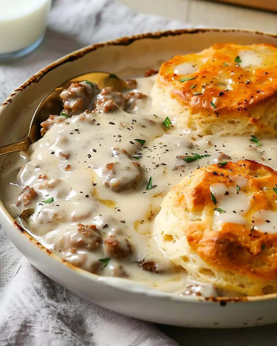 Enjoy a comforting dish of Easy Sausage Gravy and Biscuits, perfect for a weekend breakfast or brunch.