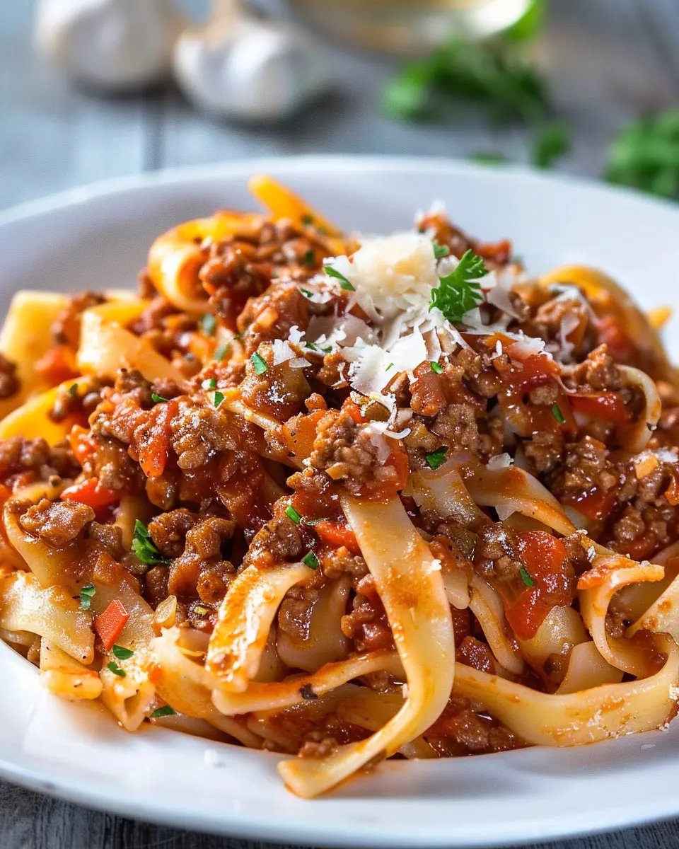 A comforting ground beef pasta recipe simmered in a rich tomato sauce, perfect for cozy nights.
