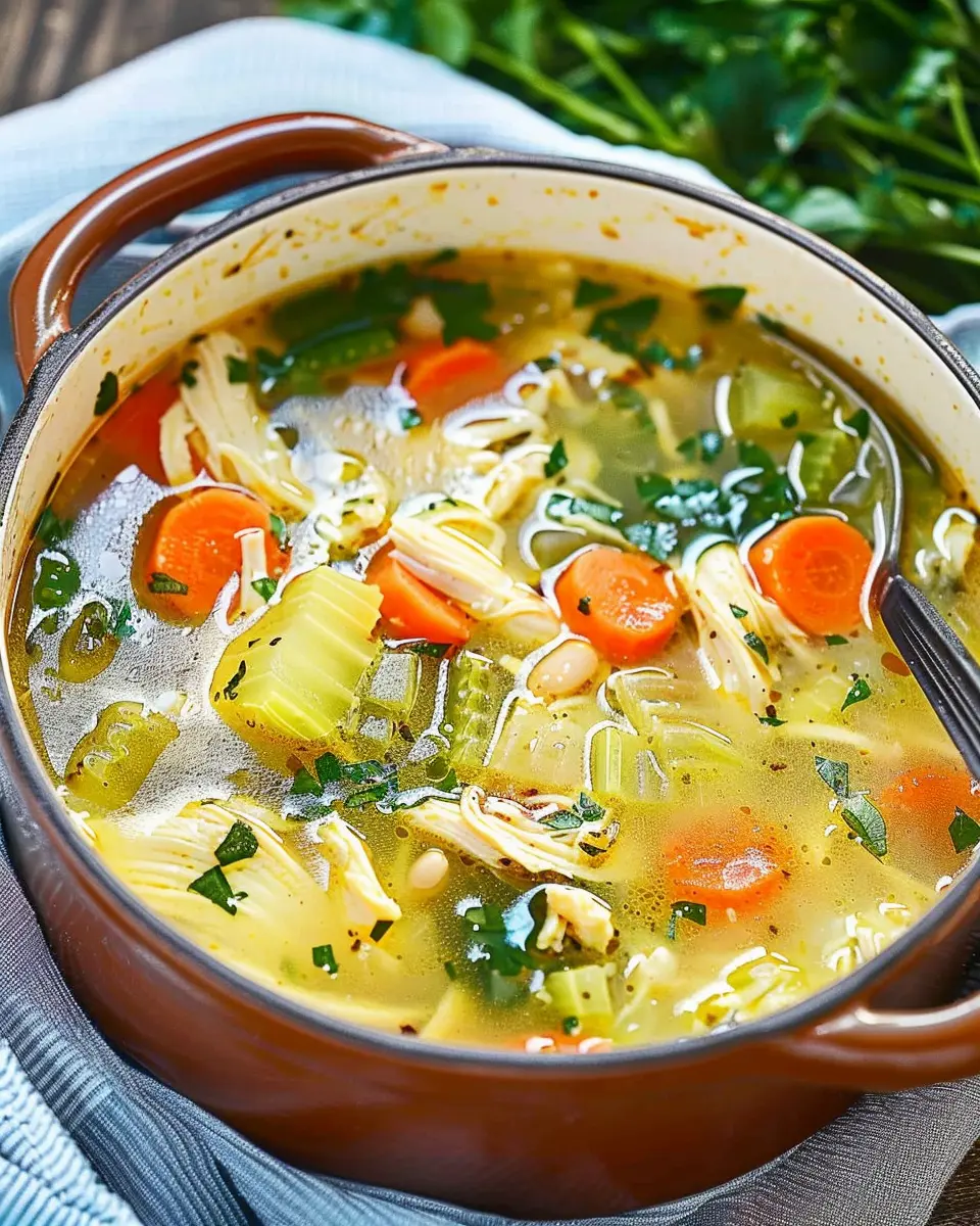 Now it’s time to enrich that beautiful broth. Pour in the chicken broth and bring it to a simmer. As the liquid heats, add your fresh herbs—thyme and parsley—as well as the bay leaves. Herbs contain powerful antioxidants and provide a lovely aroma that enhances the overall experience of the soup. According to a study published in the Journal of Nutrition, herbs can even boost your immune system. Talk about a win-win!
