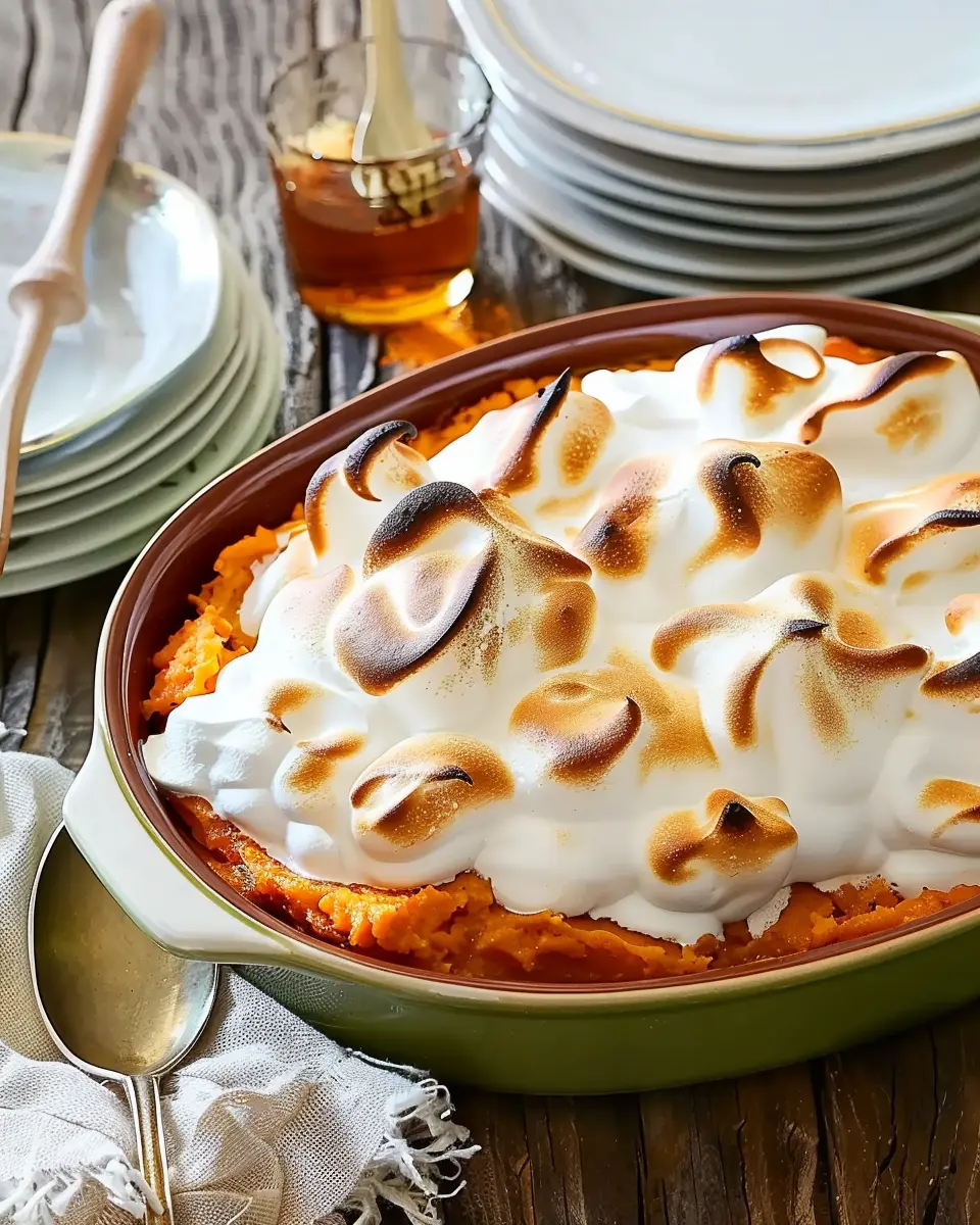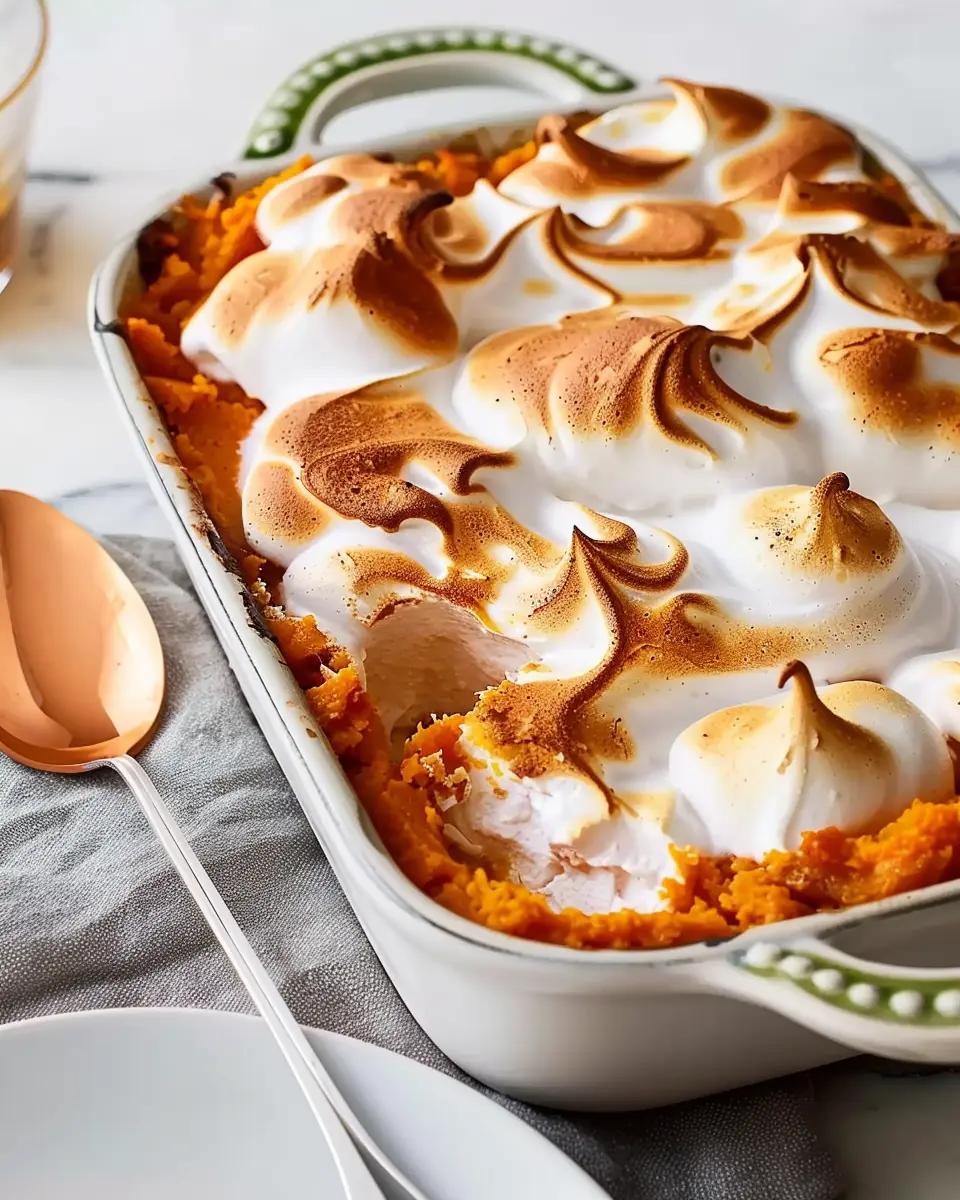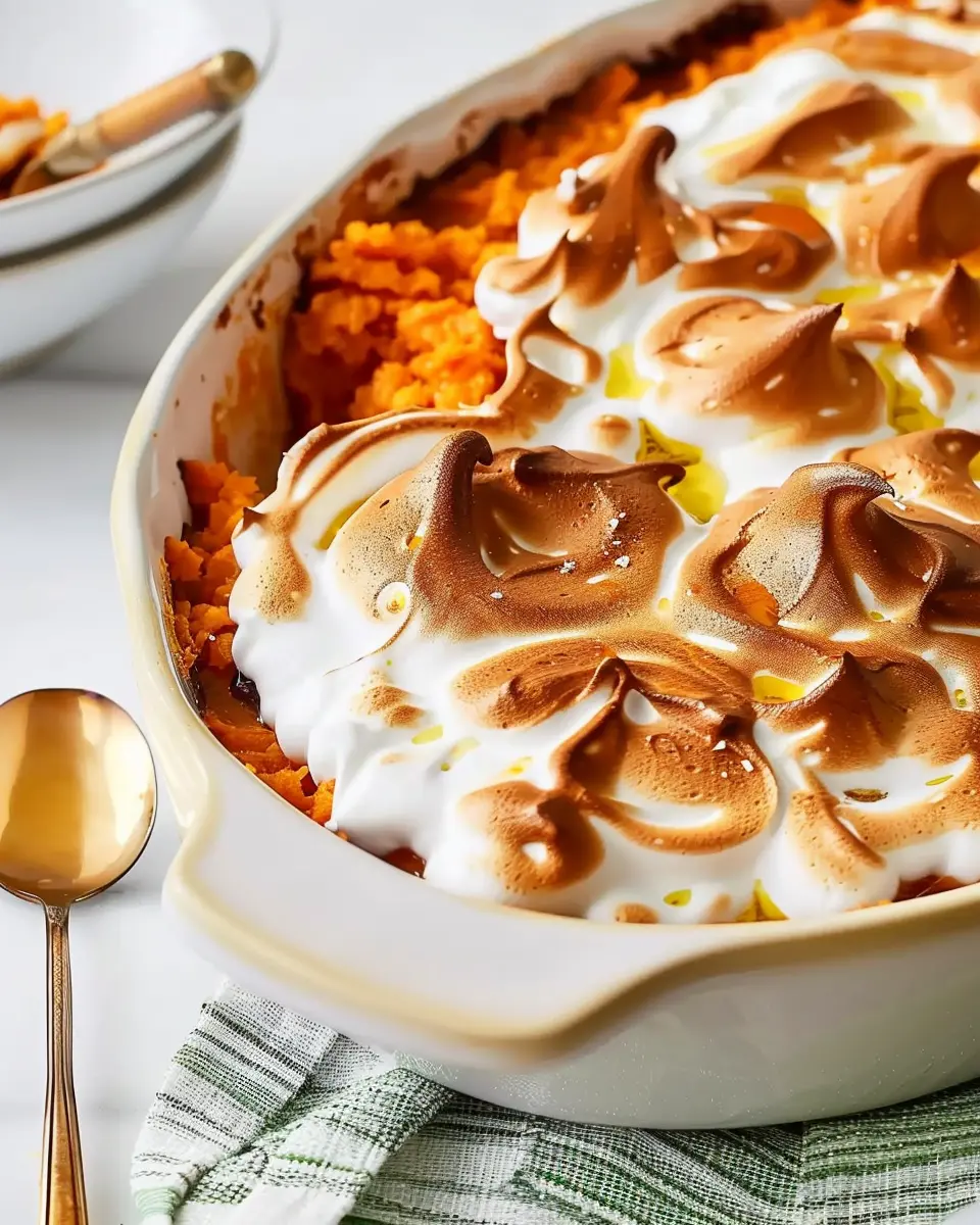 A warm and delightful Meringue-Topped Sweet Potato Casserole that embodies the essence of cozy comfort food.