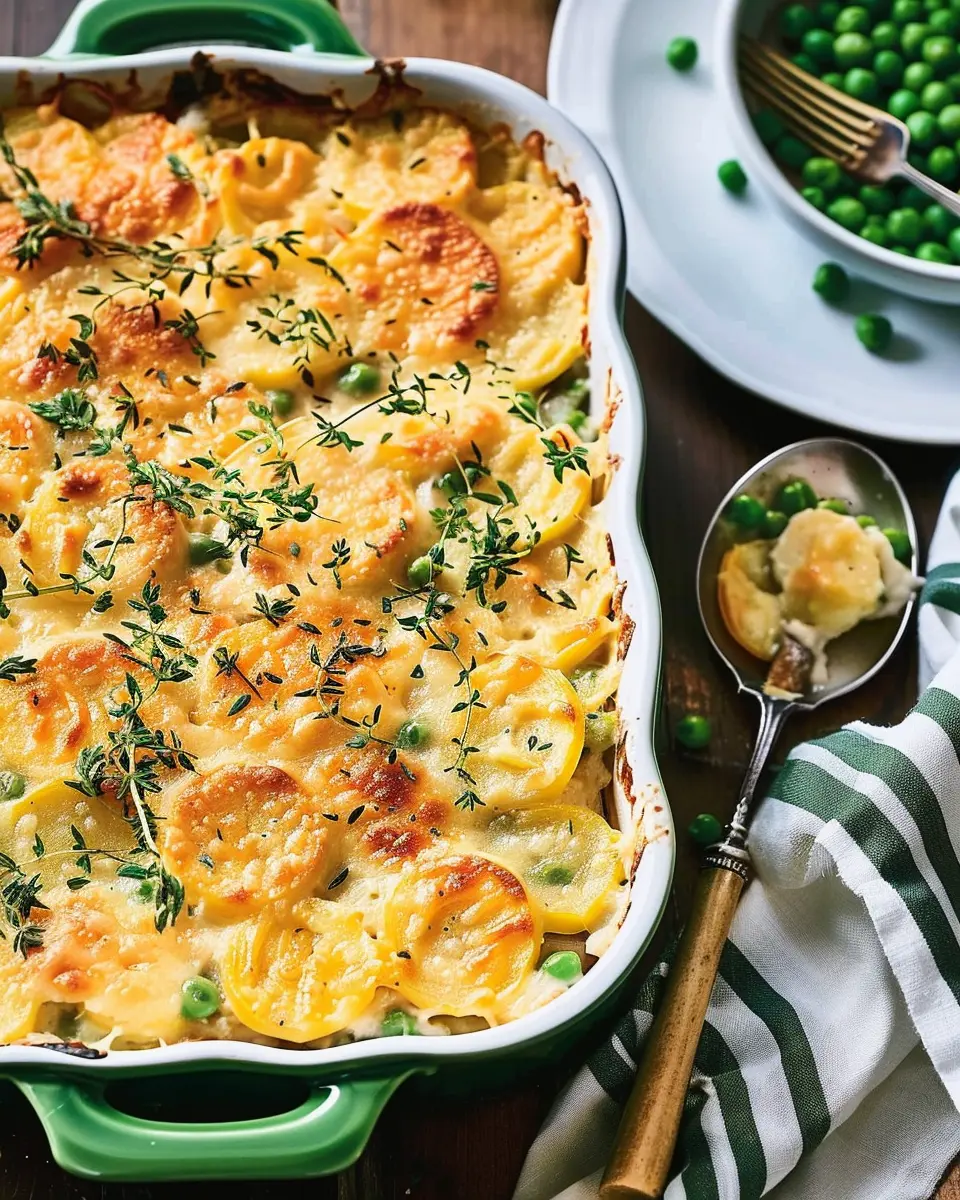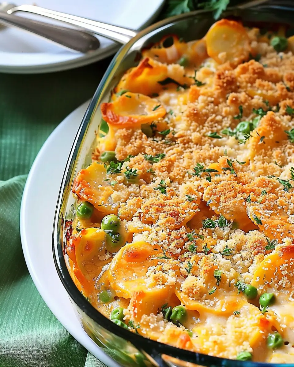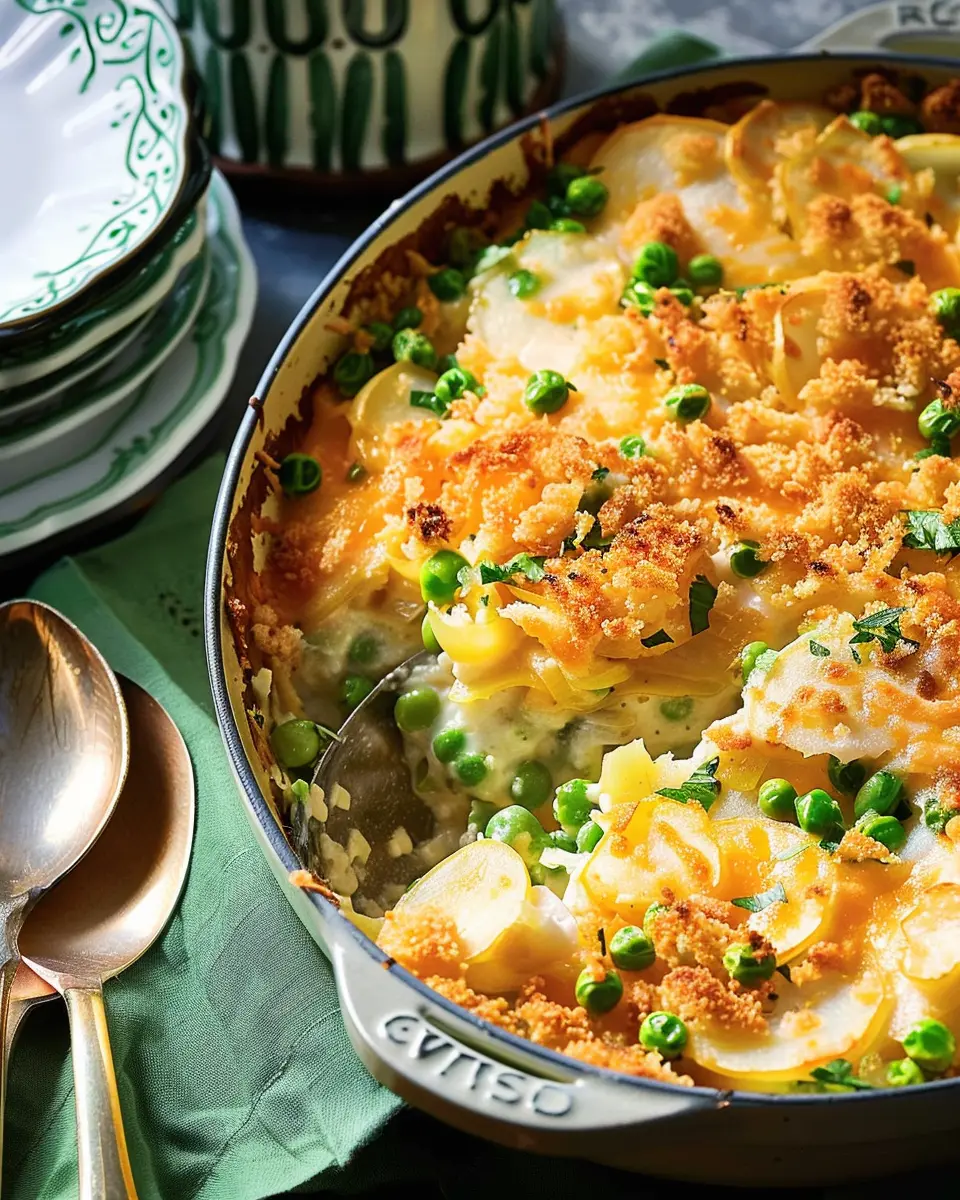 A comforting casserole featuring peas and turkey bacon, perfect for family meals or gatherings.