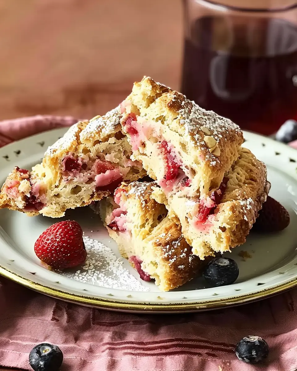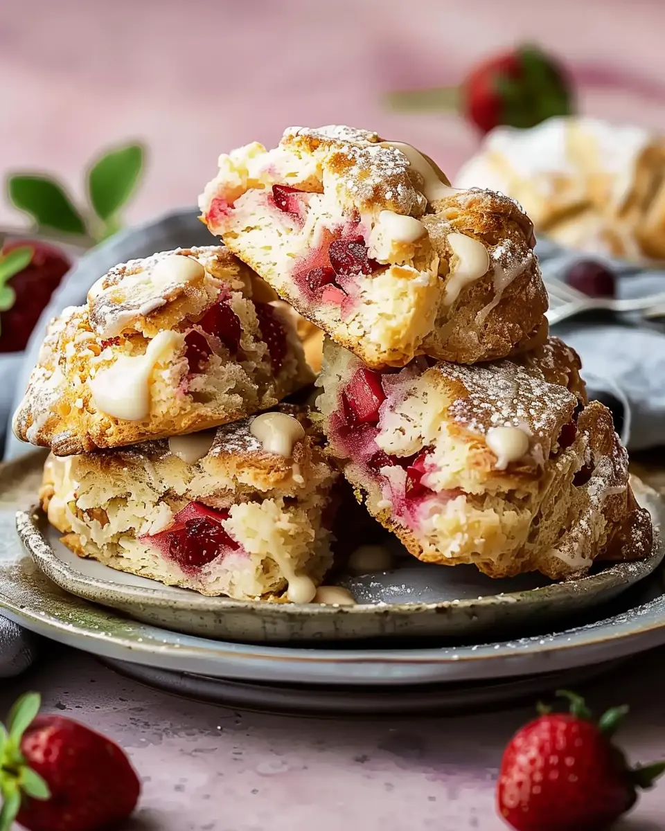 Delicious scones that combine the tartness of rhubarb and the sweetness of strawberries, perfect for any occasion.