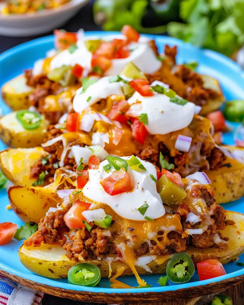 Enjoy a delicious blend of flavors with these Taco Potatoes, topped with turkey bacon and chicken ham.